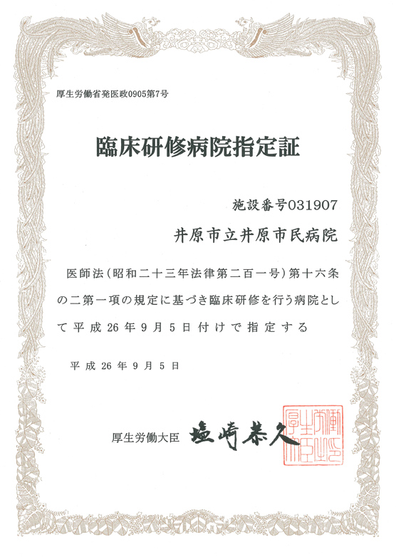 当院は、医師法(昭和二十三年法律第二百一号)第十六条の二第一項の規定にもとづき、臨床研修を行なう病院として、厚生労働省より2014年(平成26年)9月5日付けで指定証を受領しました。